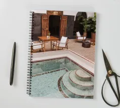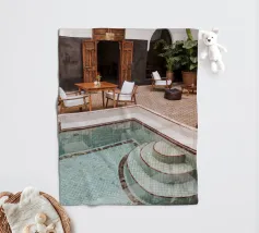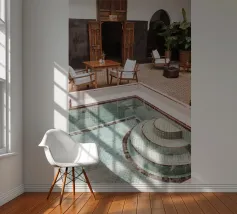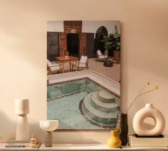 Interno di riad bohémien con piscina a Marrakech, Marocco
