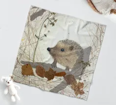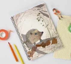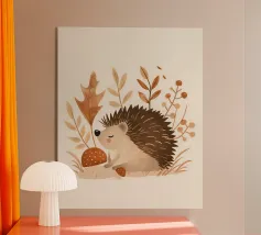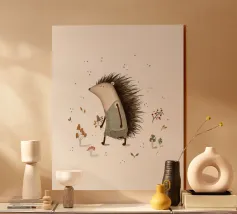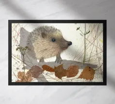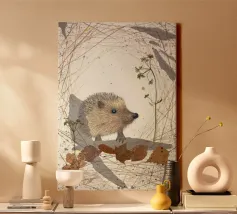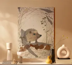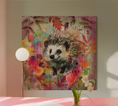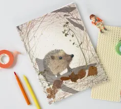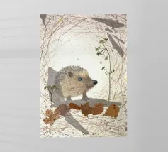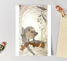 Disegno fatto a mano (originale in formato DIN A4). Mostra un piccolo riccio con foglie e fiori. Per il disegno ho utilizzato i seguenti materiali: Matita, matita colorata, matita acquerellabile, inchiostro, foglie pressate, fiori secchi, carta strappata, fineliner. Il disegno è stato realizzato a mano e poi digitalizzato per la riproduzione.