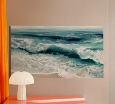 Onde scure e arricciate si gonfiano con energia prima di ripiegarsi in un litorale spumeggiante. Le texture stratificate evocano la forza nascosta sotto la superficie, dove la luce incontra la profondità.