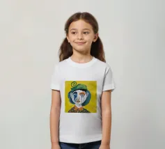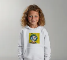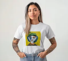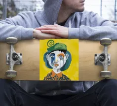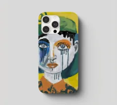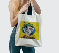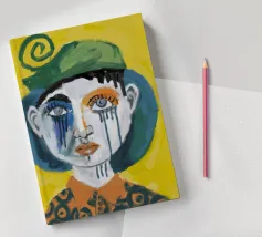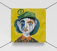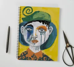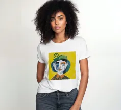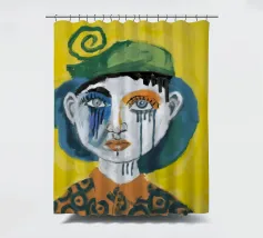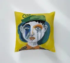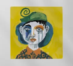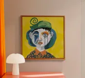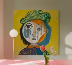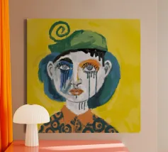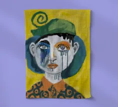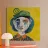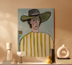 This painting depicts a figure wearing a green hat and colorful clothing. The background is yellow, creating a cheerful and quirky atmosphere.