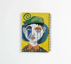 Questo dipinto raffigura una figura che indossa un cappello verde e abiti colorati. Lo sfondo è giallo e crea un'atmosfera allegra e stravagante.