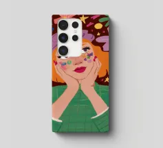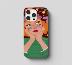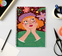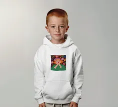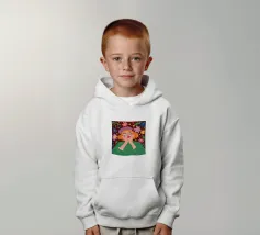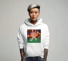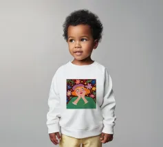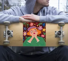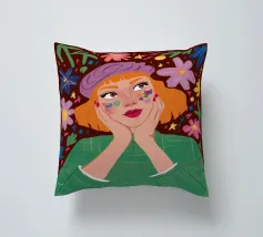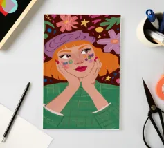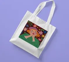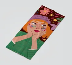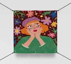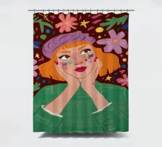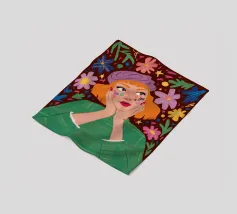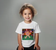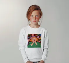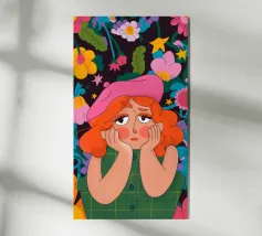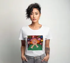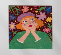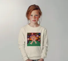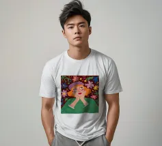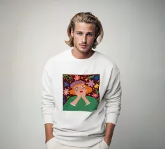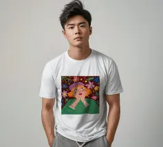 Questa opera d'arte raffigura una figura con capelli arancioni e camicia verde, circondata da una serie di fiori. Lo sfondo è pieno di motivi floreali colorati, che creano un'atmosfera sognante e riverente.
