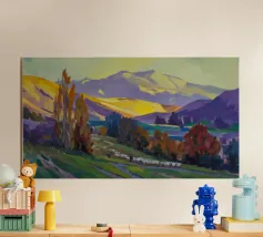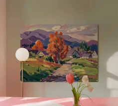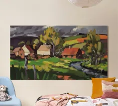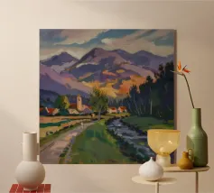 Un sereno dipinto di paesaggio raffigura un limpido ruscello che scorre in una valle, con un ponte di legno che lo attraversa e che conduce a case immerse tra alberi e dolci colline sotto un cielo morbido, trasmettendo un senso di pacifica bellezza naturale.