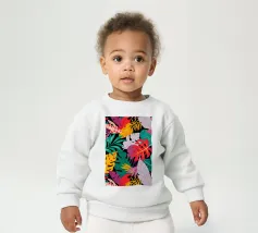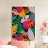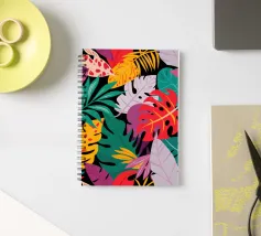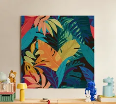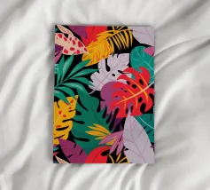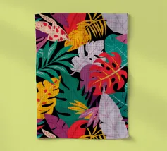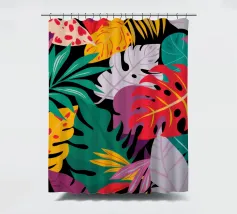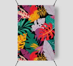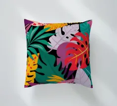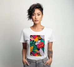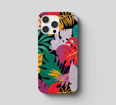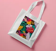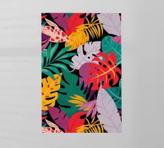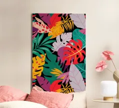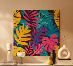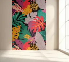 Un motivo coloratissimo di fiori e foglie tropicali in rosa, rosso, arancione e verde acqua, che crea una festa visiva gioiosa ed energica.