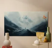 Un viaggiatore solitario cammina lungo una strada di montagna buia e nebbiosa, circondata da imponenti cime innevate. Una fitta nebbia avvolge la scena, creando un'atmosfera misteriosa e drammatica. Il paesaggio freddo e desolato accresce il senso di solitudine e avventura.