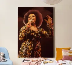 Una donna con un'acconciatura afro canta appassionatamente sul palco, tenendo un microfono in una mano.