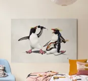 Comical illustration of a pair of crazy Rockhopper penguins getting down to the riff that can sum from their rock heritage and music vibes.
