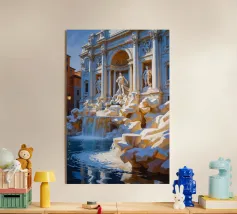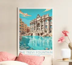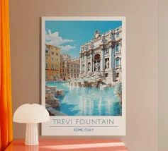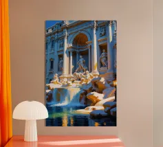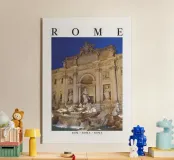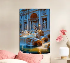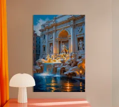Eine nächtliche Szene des Trevi-Brunnens in Rom erstrahlt im warmen Licht. Das barocke Meisterwerk beeindruckt mit prächtigen Skulpturen und filigranen Details, umspielt von sanftem Wasser. Stilvolle Typografie rahmt die sommerliche Atmosphäre einer lauen Nacht ein. Der dunkle Himmel kontrastiert harmonisch mit der Beleuchtung, die den Brunnen majestätisch in Szene setzt. Eine Einladung, die Magie Roms zu erleben.