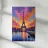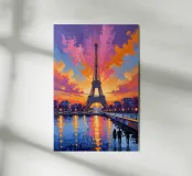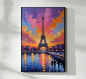 Questo vibrante dipinto impressionista cattura la Torre Eiffel durante il crepuscolo, circondata da un vivido arazzo di colori. Ricchi colori viola e arancioni dominano il cielo, mentre la torre risplende maestosa, riflettendosi splendidamente nella Senna. Coppie in abiti eleganti sono raffigurate mentre passeggiano lungo la riva illuminata del fiume, enfatizzando l'atmosfera romantica. La composizione fonde pennellate espressive con un uso equilibrato di luce e colore, evocando l'essenza di Parigi come città dell'amore e dell'arte. Questo dipinto celebra l'iconico punto di riferimento come simbolo senza tempo di romanticismo e cultura.