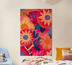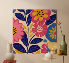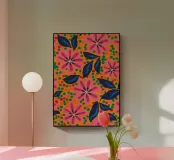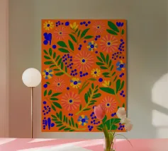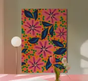 Un fitto disegno di fiori stilizzati in rosa caldo e blu scuro con centri arancioni su uno sfondo scuro. Lo stile è audace, vibrante e grafico.