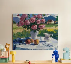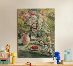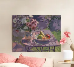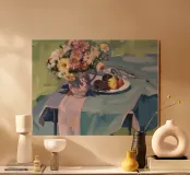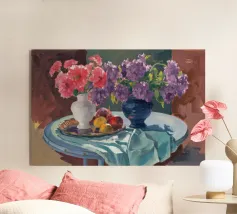 A charming still life featuring a bowl of vibrant, earthy-toned flowers, likely dahlias or zinnias, alongside a plate with dark plums and a delicate pastry, all arranged on a muted grey-blue table, suggesting a rustic morning treat.