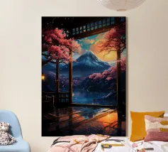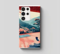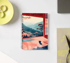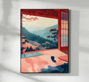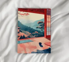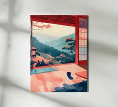 Il disegno "Ryokan Mountain View" mostra la vista panoramica mozzafiato di una camera ryokan tradizionale sulle montagne giapponesi. Con elementi acquerellati e ispirati ai classici ukiyo-e, cattura perfettamente la tranquillità e la bellezza dell'ospitalità giapponese.