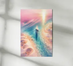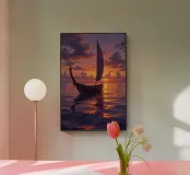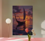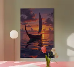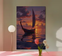 Una barca a vela tradizionale si crogiola nel bagliore di un tramonto spettacolare in questo splendido dipinto. Le tonalità infuocate del cielo, arancione e viola, si fondono perfettamente con l'oceano tranquillo, riflettendo un percorso dorato verso l'infinito. La vela intricata e dettagliata e lo scafo in legno invecchiato evidenziano la bellezza duratura dell'artigianato marittimo. Questo sereno paesaggio marino cattura un momento di tranquilla meraviglia, invitando gli spettatori a intraprendere il proprio viaggio di esplorazione e immaginazione. Un perfetto omaggio al romanticismo del mare.
