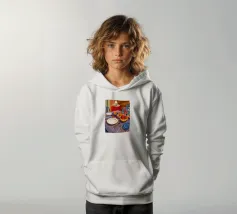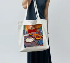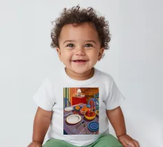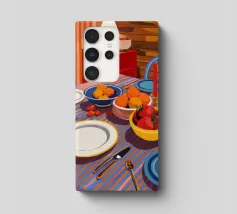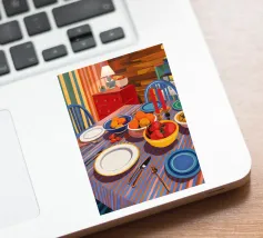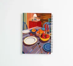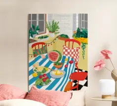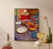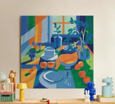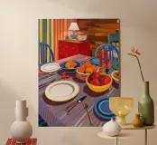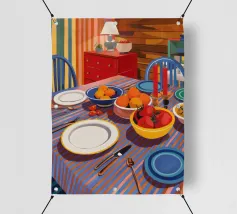 Una scena di sala da pranzo allegra e vivace, con una tavola imbandita e piena di ciotole di frutta colorate e piatti a righe. La scena è incorniciata da una sedia rossa e da un mobile blu, che creano un'atmosfera calda e invitante.
