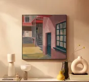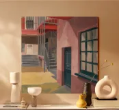 Una complessa scena urbana è resa con un'attenzione particolare alle forme geometriche e a un'audace tavolozza di colori rosa, verde acqua e rosso. Una scala esterna fornisce un forte elemento compositivo, guidando l'occhio attraverso le forme architettoniche astratte.