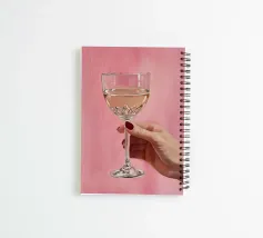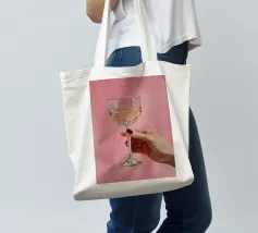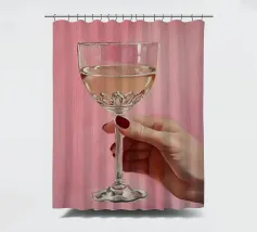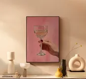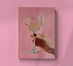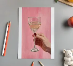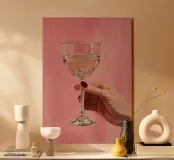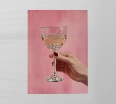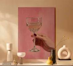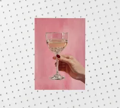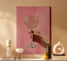 Dipinto a olio raffigurante una mano femminile che regge un bicchiere di champagne su uno sfondo rosa. La composizione è semplice, con colori femminili e grande attenzione ai dettagli.