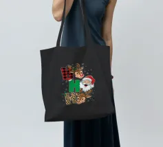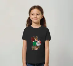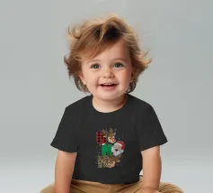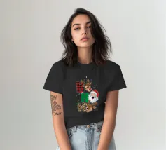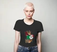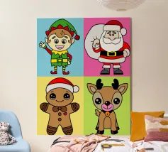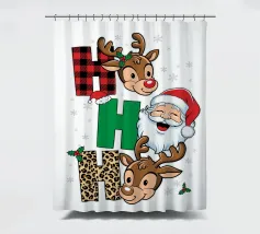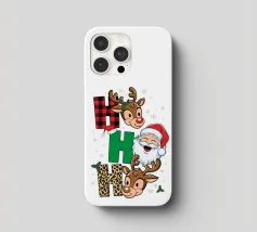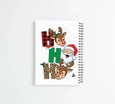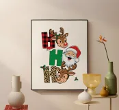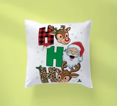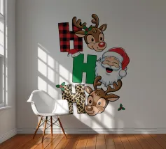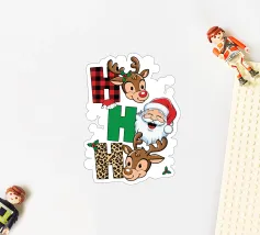 Un disegno festoso presenta allegri volti di renne e Babbo Natale in cartone animato abbinati a tre grandi lettere "H" colorate, ciascuna con motivi diversi. Fiocchi di neve e piccole decorazioni aggiungono un tocco stagionale alla composizione.