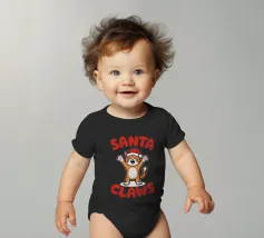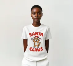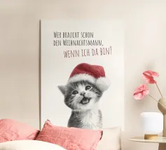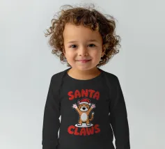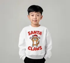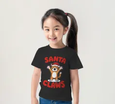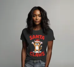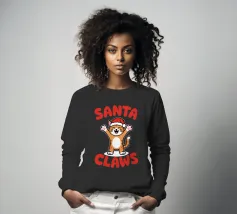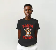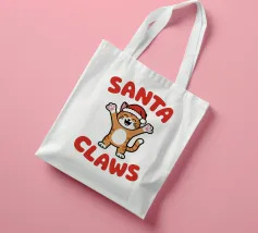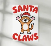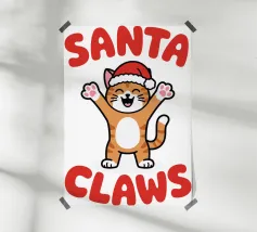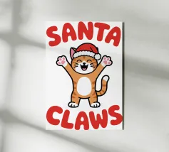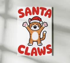 Un allegro gatto dei cartoni animati, vestito con un cappello da Babbo Natale, agita le zampe eccitato. La frase "Artigli di Babbo Natale" è scritta in grassetto a lettere rosse intorno al gatto.