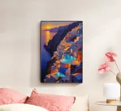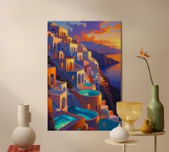 Questo dipinto accattivante ritrae l'incantevole bellezza di Santorini durante il crepuscolo, quando il cielo si trasforma in arancioni e viola profondi. Le case a schiera, illuminate da calde luci dorate, scendono a cascata lungo la scogliera, conducendo lo sguardo verso lo scintillante Mar Egeo. Le piscine a sfioro e le scale creano schemi fluidi che si armonizzano con le curve naturali della costa. Questo capolavoro è una celebrazione dell'architettura unica di Santorini e del magico gioco di luci, colori e paesaggi alla fine della giornata.