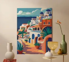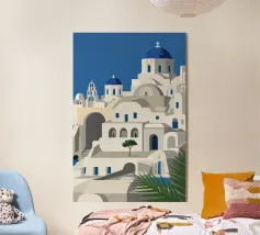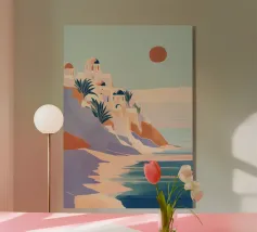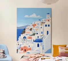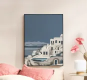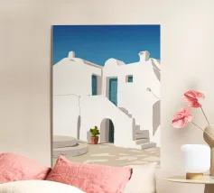 Una rappresentazione minimalista dell'iconica architettura imbiancata di Santorini, in Grecia, sotto un cielo calmo e crepuscolare, che trasmette un profondo senso di pace, tranquillità e bellezza senza tempo.