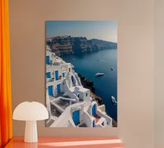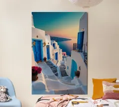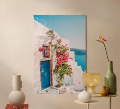 Una scena radiosa delle strette scale bianche di Santorini, che si fondono perfettamente con il blu sereno del Mar Egeo. Le porte e i fiori vivaci aggiungono sprazzi di colore, mentre il sentiero si snoda con grazia attraverso quest'isola idilliaca. La composizione cattura la bellezza senza tempo e l'essenza tranquilla della destinazione più famosa della Grecia.