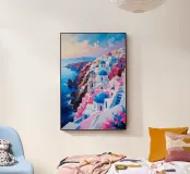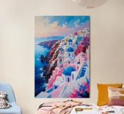 Ritratto impressionista del famoso villaggio di Oia a Santorini, quest'opera d'arte celebra l'armonia tra le scogliere frastagliate e gli edifici imbiancati. Le cupole rosa e blu, sullo sfondo del Mar Egeo scintillante, emanano calore e bellezza mediterranea. Morbide nuvole riempiono il cielo, riflettendo i colori del mare e dell'architettura. La disposizione a terrazze delle case e le vibranti fioriture creano una scena dinamica ma tranquilla, perfetta per catturare lo spirito di questa iconica isola greca. Questo dipinto irradia la magia del fascino senza tempo di Santorini.