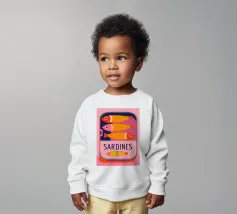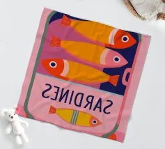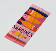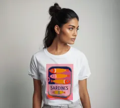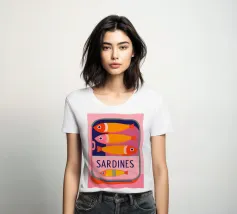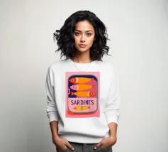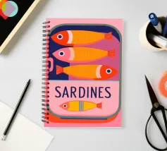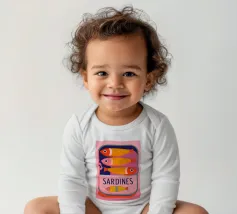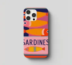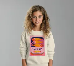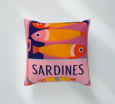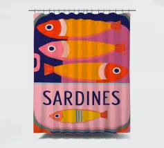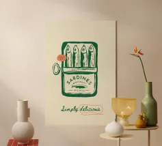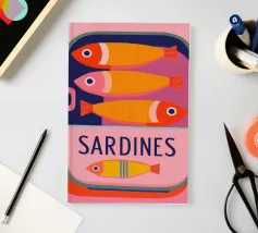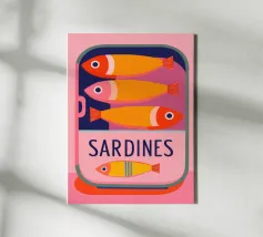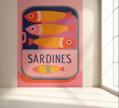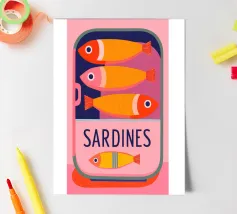 A playful illustration of sardines in a colorful tin with simple shapes and soft tones.