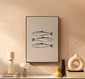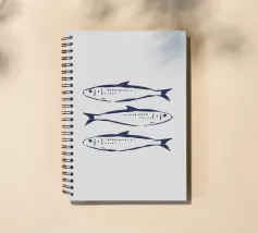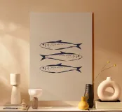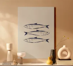 Illustrazione in stile disegno al tratto di sardine blu su sfondo beige. Disegno originale creato su Procreate.