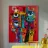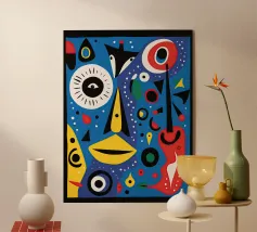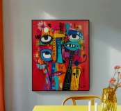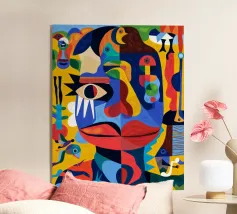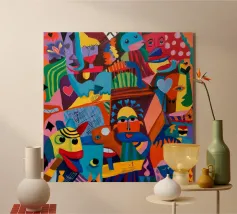 Un dipinto astratto audace e colorato con un volto surreale composto da occhi espressivi, tratti esagerati e strumenti musicali. Le pennellate dinamiche e la tavolozza vivida creano una composizione sorprendente ed energica.