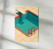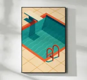 Poster raffigurante una piscina estiva con una scala arancione e riflessi d'acqua stilizzati. Un gioco di ombre, luci grafiche e una tavolozza solare. Perfetto per un look vintage e rinfrescante.