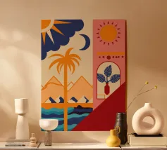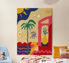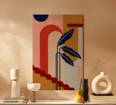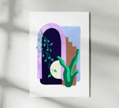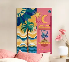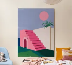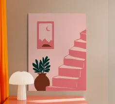Una scena d'interni stravagante e astratta con una scala rosa, piante in vaso e un sole e una luna nel cielo visti attraverso un arco. L'opera d'arte è un paesaggio da sogno giocoso e bohémien.