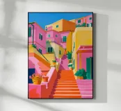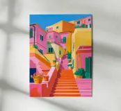 Una vivace scena di strada con edifici colorati e una scalinata rosa acceso che sale verso l'alto, evocando una vivace città costiera mediterranea o italiana.