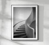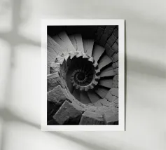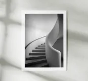 Visualizzazione in bianco e nero di un'architettura d'interni minimalista: scala a chiocciola con ampi gradini, ringhiera liscia in stucco e corrimano in metallo, immersa in una luce morbida che accarezza le curve. Una composizione fluida, elegante e rilassante, ideale per ampliare visivamente lo spazio e portare calma e modernità. Perfetta per un soggiorno, una camera da letto, un corridoio o un ufficio, in stile contemporaneo, scandinavo, japandi o wabi-sabi.
