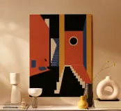 Primo piano astratto e minimalista di una forma architettonica, con una scala bianca e spoglia su una parete arancione con una finestra circolare nera e ombre profonde.