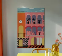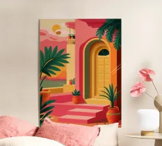 Scale rosse e vivaci conducono attraverso un edificio colorato e semplificato verso un lussureggiante ingresso ad arco, suggerendo un viaggio verso una destinazione bella ed esotica.