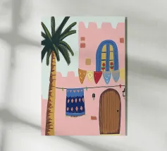 Una tranquilla scena notturna mediterranea con un affascinante edificio rosa con le tradizionali persiane verdi e un'invitante scala esterna. Le palme si stagliano su un cielo blu intenso ornato di stelle e di una luna splendente, con una singola finestra illuminata che aggiunge calore.