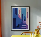 Un'illustrazione moderna e colorata con due gatti neri in un contesto architettonico di vicoli e scale dalle vibranti tonalità di blu e rosa. Il gioco di luci e ombre aggiunge un'atmosfera misteriosa e accattivante, ideale per evocare eleganza e intrigo in uno stile contemporaneo.