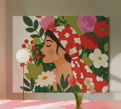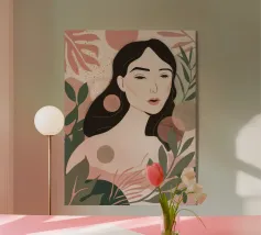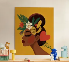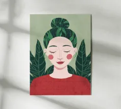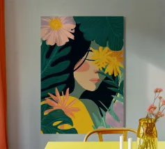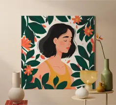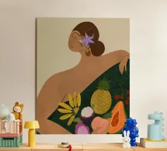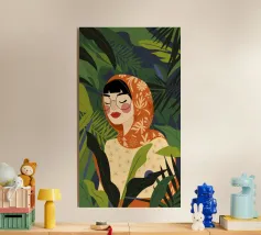 Ritratto di una donna che indossa un foulard colorato, con il volto incorniciato da foglie verdi e da una stampa di ananas. La composizione è una vibrante, elegante e bellissima celebrazione della moda e della bellezza tropicale.
