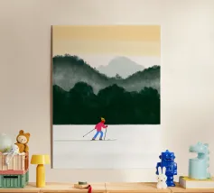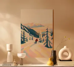 L'immagine mostra una scena dinamica di sport invernali: una persona con un vistoso abbigliamento da sci rosso scia lungo un pendio di montagna innevato. Le linee chiare e i colori decisi conferiscono all'illustrazione uno stile moderno, quasi grafico. Le montagne innevate e gli abeti stilizzati sullo sfondo creano uno sfondo atmosferico che enfatizza il movimento e la vicinanza alla natura allo stesso tempo. Sembra un misto di energia sportiva e tranquillità paesaggistica.