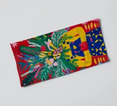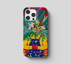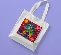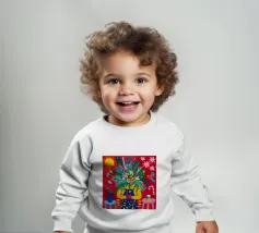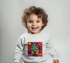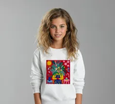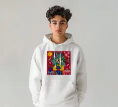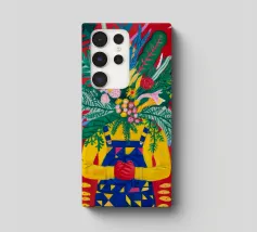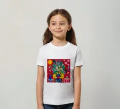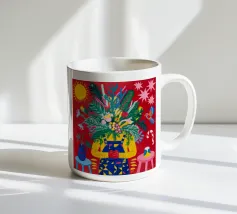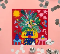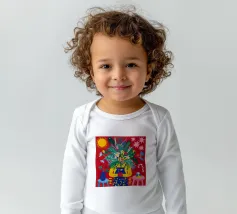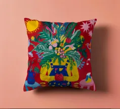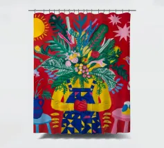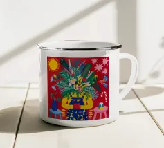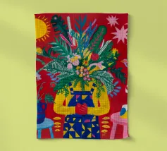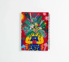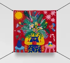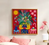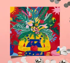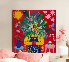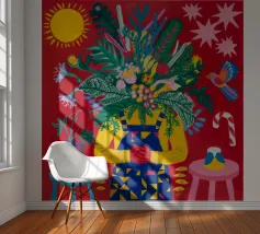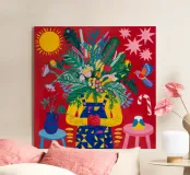 Questo dipinto mostra una testa piena di fiori e vegetazione lussureggiante. Lo sfondo è rosso con stelle e un sole giallo.