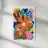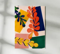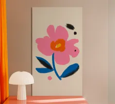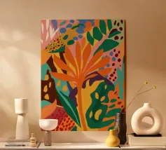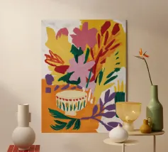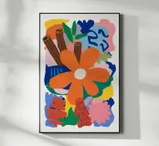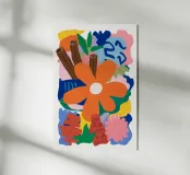 Una forma centrale arancione simile a un fiore esplode in mezzo a un turbinio di forme astratte ed elementi botanici. La composizione è dinamica ed espressiva, con steli blu, accenti rossi e uno sfondo beige strutturato, che cattura un momento di energia creativa.