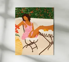 Una donna sicura di sé in bikini e pantaloncini fucsia si rilassa su una sedia con un drink, circondata da piante e fiori, incarnando il tempo libero estivo.