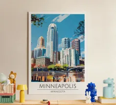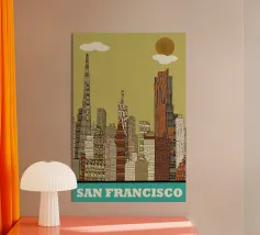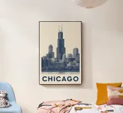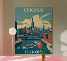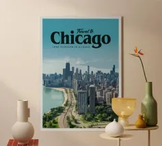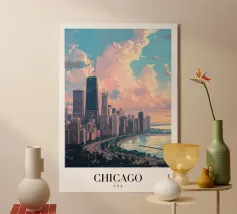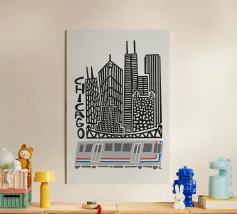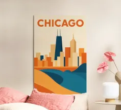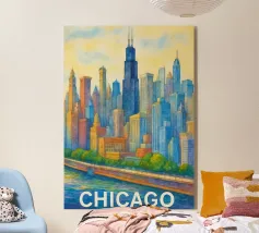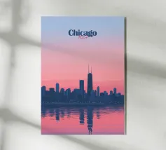 Questo poster mostra l'imponente skyline di Chicago nel caratteristico stile lino print, con la dominante Willis Tower al centro e il lago Michigan in primo piano. Perfetto per gli amanti dell'architettura americana, dell'estetica dello skyline e dei classici poster cittadini. Ideale per soggiorni, uffici o pareti creative dal sapore urbano.
