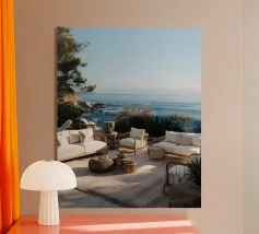 Una tranquilla terrazza costiera immersa nella luce del sole, affacciata sul blu infinito dell'oceano. Il luogo perfetto per rilassarsi, respirare e lasciare andare via le preoccupazioni.