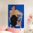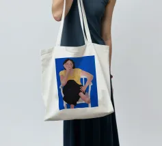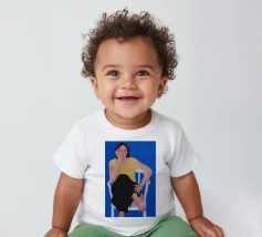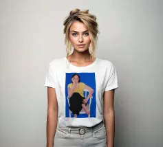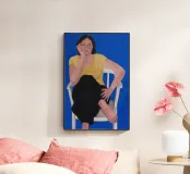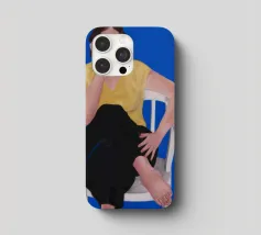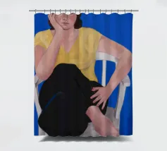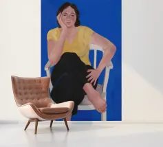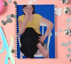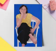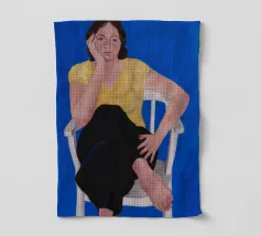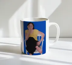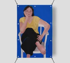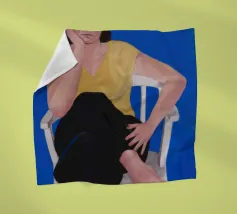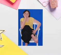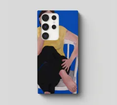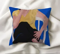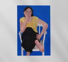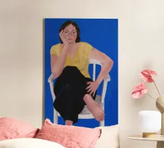 Una persona in top giallo e pantaloni neri siede con disinvoltura su una semplice sedia blu, emanando un'aria di rilassata sicurezza e stile senza sforzo su uno sfondo blu solido.