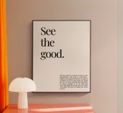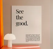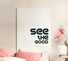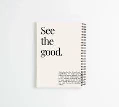 Zitat: "Vedere il bene". Kleingedrucktes: "La vita non è perfetta, ma c'è bellezza nelle imperfezioni. Il bene è ovunque, nascosto nelle risate degli amici, nella quiete di un'alba o anche nelle lezioni di una giornata difficile. Non si tratta di ignorare le parti difficili, ma di scegliere di vedere la luce che vi brilla attraverso. Aprite gli occhi. Aprite la mente. Il bene sta aspettando che tu lo noti"; Beigefarbener Hintergrund