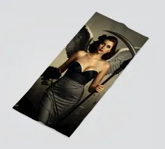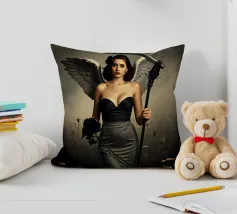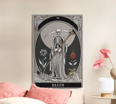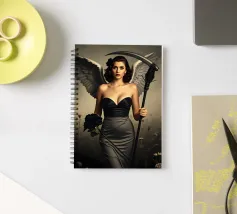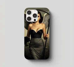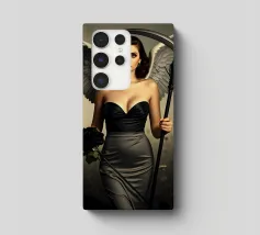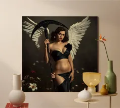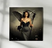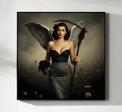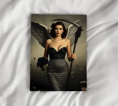 Pin-Up di Angelo della Morte in stile Noir Questa immagine mostra un'affascinante modella pin-up nei panni dell'Angelo della Morte, in posa in un drammatico campo di fiori appassiti, circondata da una nebbia inquietante, con una falce e rose nere, in un mix di film noir degli anni '40 ed elegante arte pin-up.