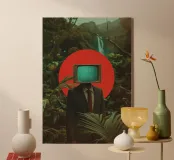 Un collage digitale surreale che mescola natura, tecnologia e distacco esistenziale. Una figura senza volto con un monitor CRT retrò al posto della testa, in piedi in una giungla tropicale. Sullo schermo si legge "YOU'RE OFFLINE", una tranquilla ribellione contro l'iperconnettività. Con forti contrasti, colori vivaci e un sorprendente sole rosso dietro il soggetto, quest'opera cattura la sensazione di disconnessione in un mondo iperconnesso. Perfetto per gli amanti del surrealismo botanico, dell'arte moderna del collage e dell'evasione digitale.