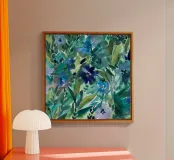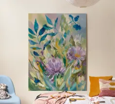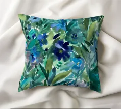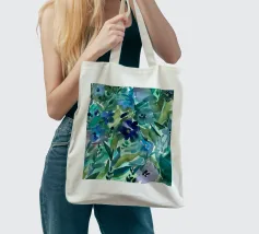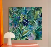Una lussureggiante composizione ad acquerello di fiori blu intenso e fogliame verde vibrante, stratificati con pennellate espressive e lavaggi dai toni freddi. Le dense forme sovrapposte evocano un giardino da sogno pieno di ritmo e movimento.
