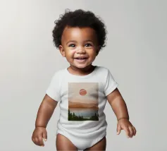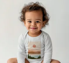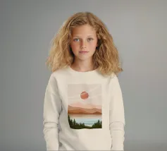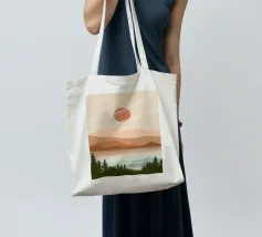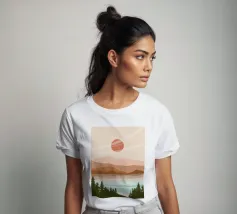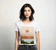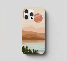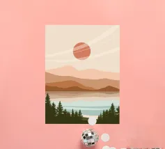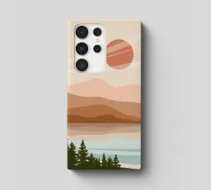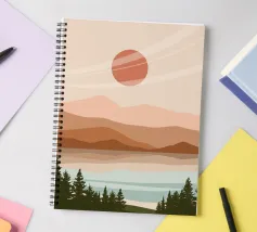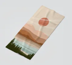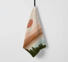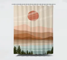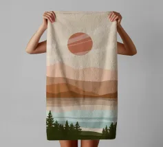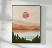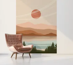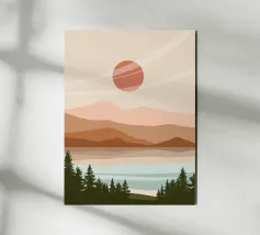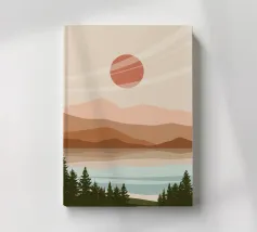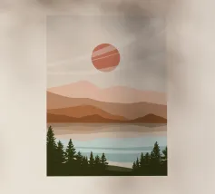 A serene landscape features layered hills and a large sun or moon, with trees silhouetted in the foreground. Warm earthy tones of brown and beige create a tranquil atmosphere.